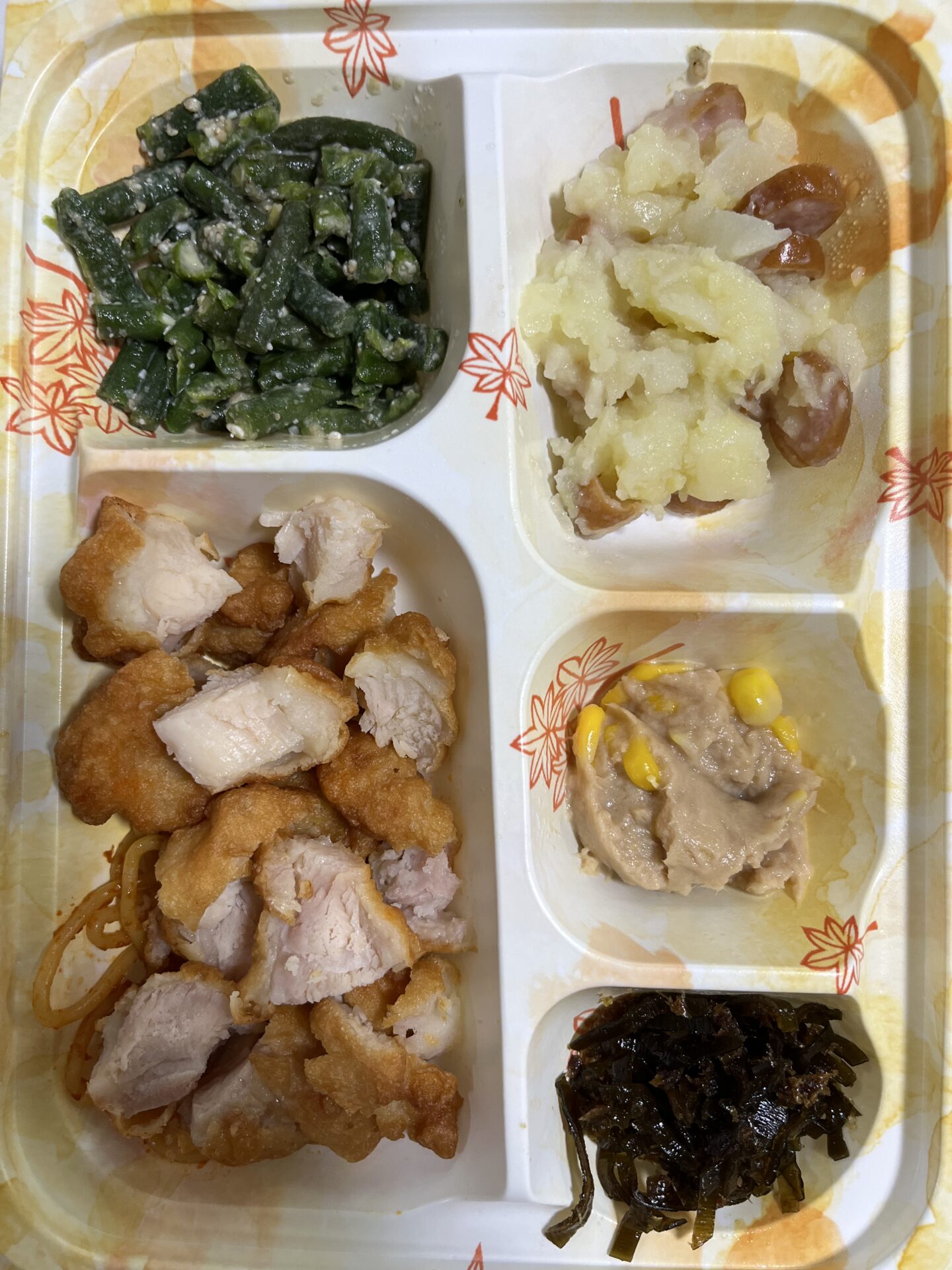 ケアマネ定期訪問日宅配cook123 【宅配クック123】ケアマネ定期訪問日。2025.11.21朝食 2025.11.21投稿 ケアマネ / 刻み普通食 / 在宅介護 / 宅配クック123 / 定期訪問日 / 朝食 2025.11.20夜133-92-36.3 2025.11.21朝 朝食 宅配クック123 刻み普通食 全体 若鶏から揚げ 若鶏から揚げ ナポリタン ささげの胡麻和え ポテトとウインナー ツナマヨコーン おかか昆布 ケアマネ定期訪問日。 母の頭をガンガンぶつける行動はマシマシになっている感じがする。 昨日ケアマネにその旨を連絡し、今日意見をもらおうと思っているが、どうだろうか? そろそろ介護認定更新もあるし・・・不安はいっぱい