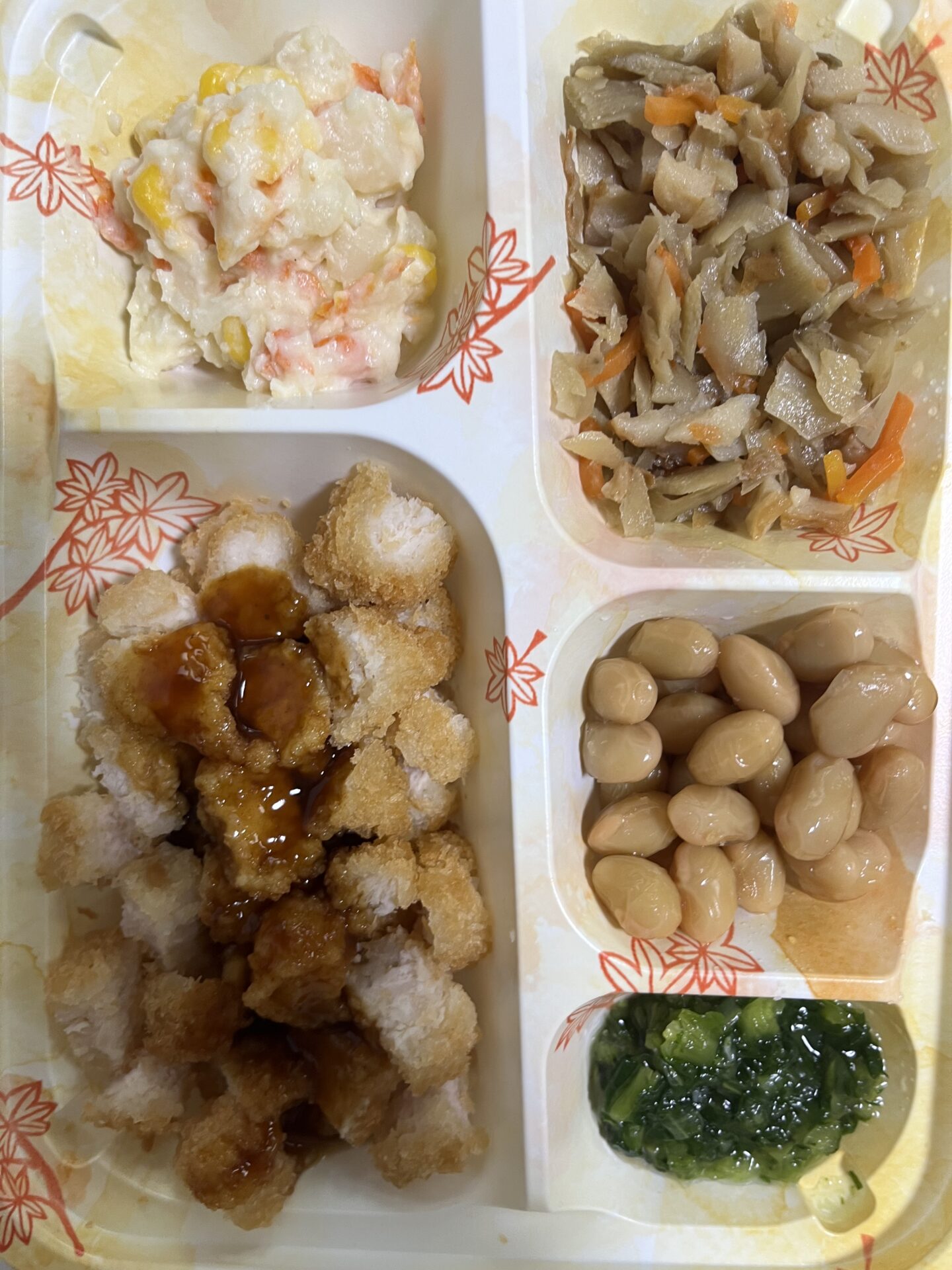 宅配cook123 【宅配クック123】庭一面が霜だけど・・・。2025.12.6朝食 2025.12.07投稿 刻み普通食 / 在宅介護 / 宅配クック123 / 春一番 / 朝食 2025.12.6夜121-83-36.5 2025.12.7朝 朝食 宅配クック123 刻み普通食 全体 チキンカツ チキンカツ ポテトサラダ ささがきぼごうと薩摩揚げの金平 大豆の甘煮 広島菜漬け フライソース 朝に雨戸を開けたら、庭一面が霜に覆われている。 冬なんだ・・・っと実感。 お尻も緩くなり、ご飯食べたっけ?っと言う母の頭には春一番が吹いているかな?