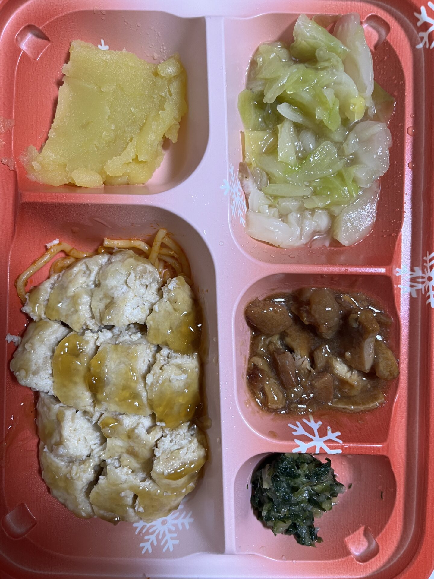 もったいない病宅配cook123 【宅配クック123】施設のクリスマスプレゼントは、戦いのゴング!?2025.12.27朝食 2025.12.27投稿 クリスマスプレゼント / ゴング / 刻み普通食 / 在宅介護 / 宅配クック123 / 戦い / 朝食 / 靴下 2025.12.26夜139-79-36.5 2025.12.27朝 朝食 宅配クック123 刻み普通食 全体 ふんわり豆腐ハンバーグ ふんわり豆腐ハンバーグ ナポリタン さつまいもの甘煮 キャベツの洋風煮 一口照り焼きチキン 広島菜漬け ディのクリスマスプレゼント。 だいたい靴下なんだよね。 足が浮腫んでいるので、プレゼント靴下を履くと確実に母の足が一回り大きくなる。 しかし、もったいないから履きたいという母。 クリスマスは毎年戦いのゴングが鳴る。