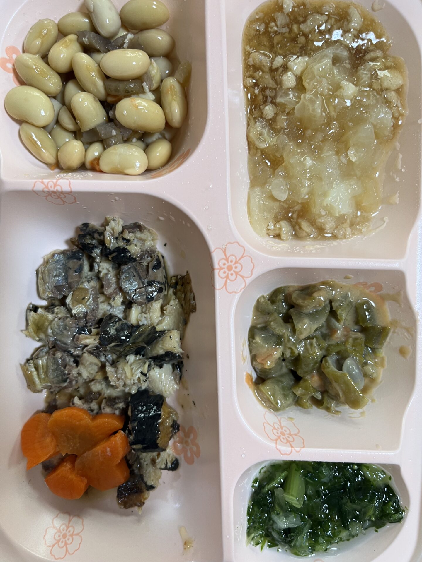 宅配cook123 【宅配クック123】春はトラブル多発だが、今日は最大級・・・。2025.3.17朝食 2025.03.20更新 トラブル / 刻み普通食 / 在宅介護 / 宅配クック123 / 春 / 最大級 / 朝食 2025.3.16夜142-81-36.7 2025.3.17朝112-59-36.4 朝食 宅配クック123 刻み普通食 全体 メインのおかず(いわし紀州煮) いわし紀州煮 花形人参 おかず豆 大根のそぼろあん いんげんのピーナッツ和え 広島菜漬け 6時濃霧だったが、太陽が昇ると消えた。 今日はいい天気だっといい気分で起床したが、母のトイレ失敗が発覚。 手にべっとり、布団にべっとり、床にもべっとり。 春はトラブル多発だが、今回は最大級。 ため息も多発。