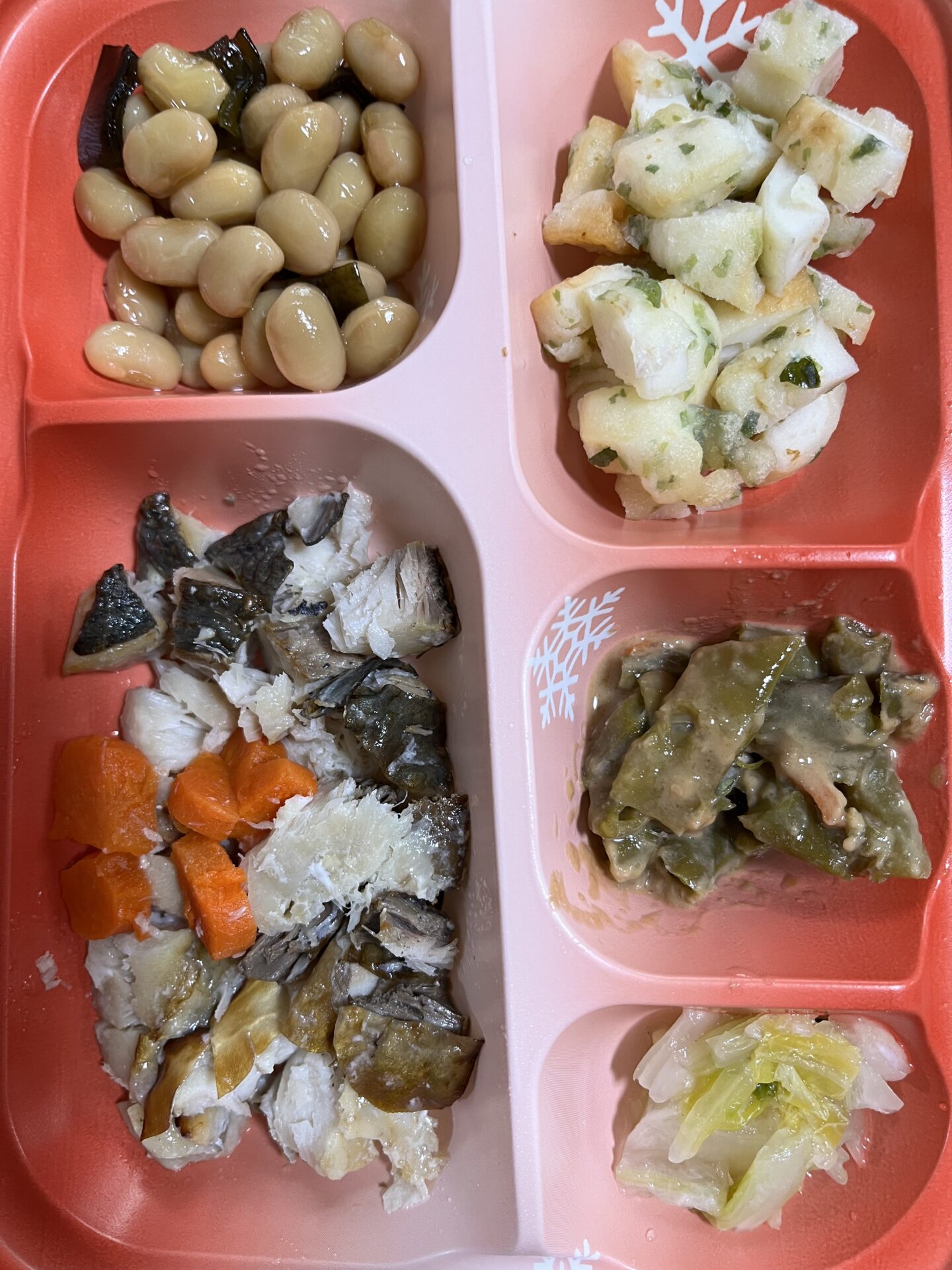 宅配cook123 【宅配クック123】大雪と勘違いした母(笑)。2025.2.23朝食 2025.03.01更新 刻み普通食 / 在宅介護 / 大雪 / 宅配クック123 / 快晴 / 朝食 2025.2.22夜143-90-36.8 2025.2.23朝109-62-36.2 朝食 宅配クック123 刻み普通食 全体 メインのおかず(あじ塩焼き) あじ塩焼き 花形人参 お豆と昆布の煮物 ちくわの磯辺揚げ(豆乳入り) いんげんのピーナッツ和え 白菜漬け ニュースで大雪、大雪・・・っと伝えるせいか? 今朝は大雪だと思っていた母。 快晴の空にぼぉーぜん! 明日は雪だからお休みすると、ディのスタッフに行ったらしい。 今日は迎えが来ないと・・・しょんぼり(笑)。